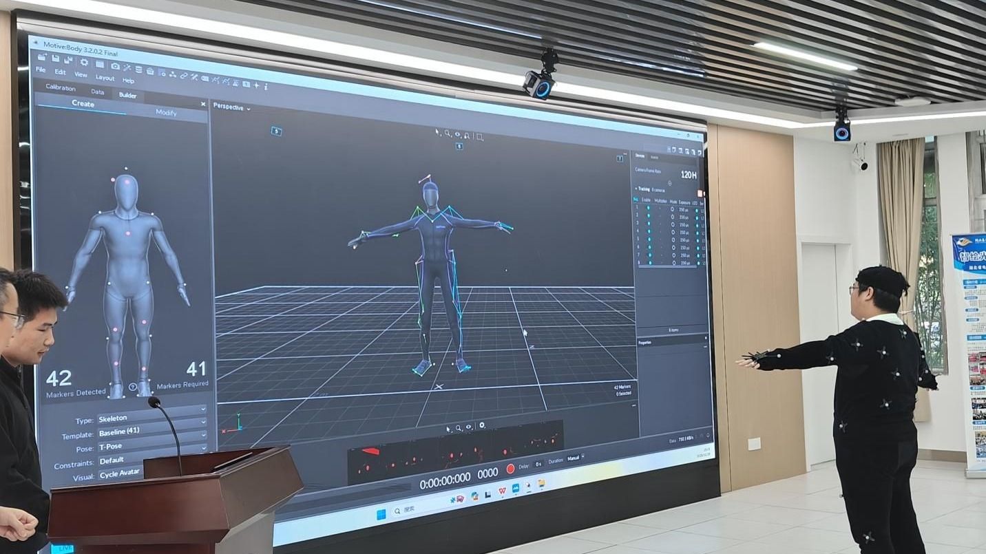 在国家虚拟仿真实验教学中心,王晓峰系统介绍了该中心围绕教学与产业需求构建的虚拟仿真平台体系,重点展示了动作捕捉与三维扫描两大核心技术在电影制作领域的创新成果。现场学生踊跃参与技术体验环节,通过穿戴专业动作捕捉设备,将实时采集的人体运动数据精准驱动屏幕中的虚拟角色,完整呈现了从真人表演到数字角色生成的技术流程。三维扫描系统同步演示了高精度数字建模过程,展现了虚拟仿真技术在电影特效制作、数字资产创建等环节的实际应用价值。