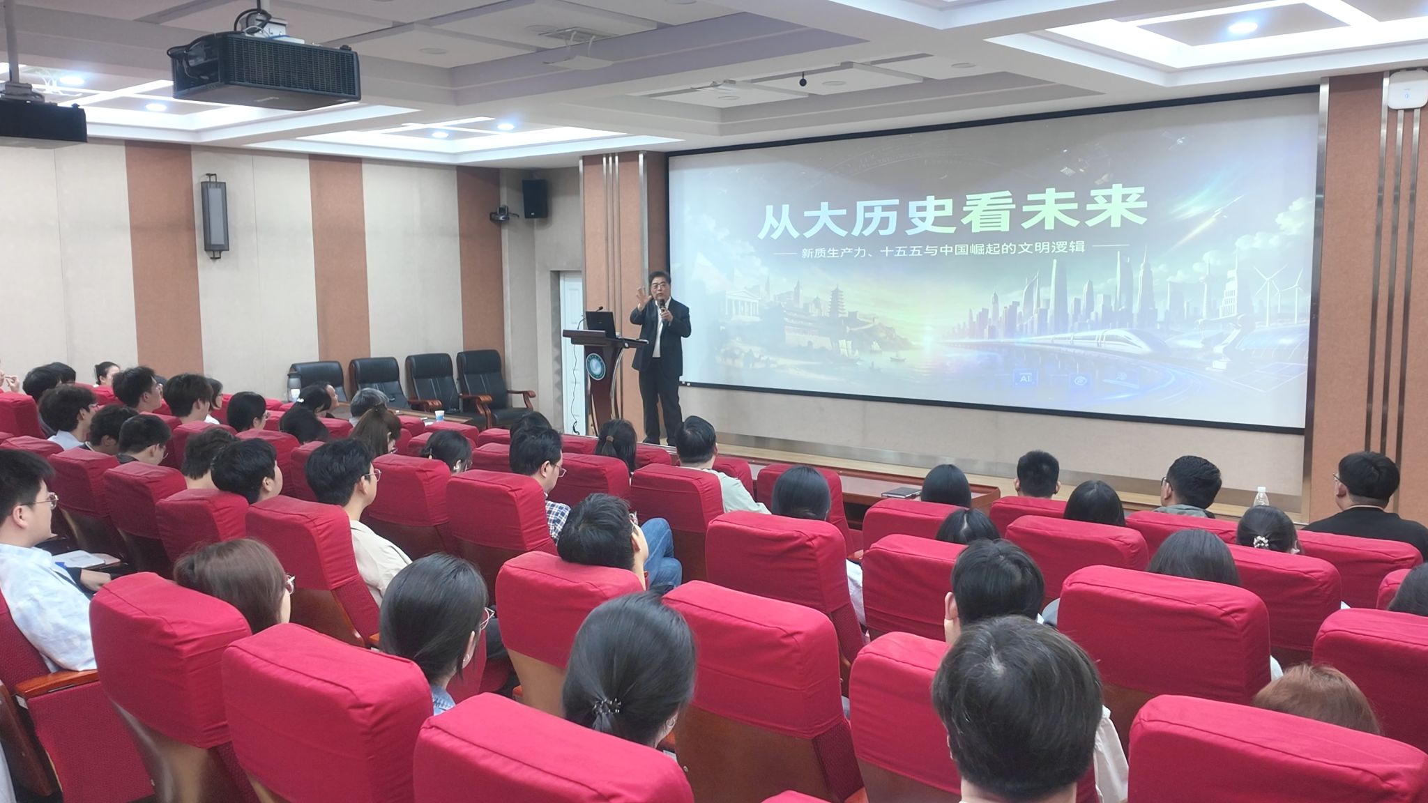 苏光明的报告以500年世界大国兴衰史为切入点,总结出技术革命是核心动力、制度创新是关键保障、文明范式决定长期走向的三大发展规律,对比西方零和博弈崛起模式与中国和合共生的文明基因,系统阐释中国式现代化的独特发展逻辑。他梳理我国从建国初期向苏联学习、改革开放后对美西方开放、到十八大以来推进科技自立自强的三大发展阶段,重点解读新质生产力的核心内涵、三大支柱与发展现状,明确“十五五”时期作为新质生产力发展加速期、文明转型奠基期的历史方位,介绍我国在科技创新、产业升级、高水平制度型开放等领域的核心战略部署。苏光明寄语在场学生:“我们不仅是这场伟大历史变革的见证者,更应该成为参与定义和创造‘新文明’的主体,以青年之姿引领时代潮流!”